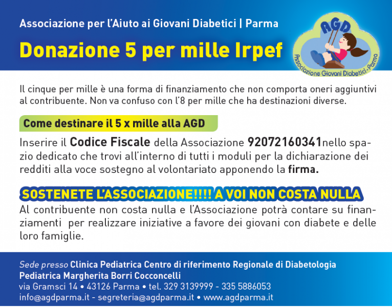 L’AGD Parma è stata fondata nel 1984 da genitori di bambini con diabete, con lo scopo di favorire la diagnosi precoce, la cura e la conoscenza del diabete giovanile, promuovendo l’informazione, l’educazione sanitaria, la sensibilizzazione delle autorità politiche e sanitarie e la solidarietà tra le Famiglie.